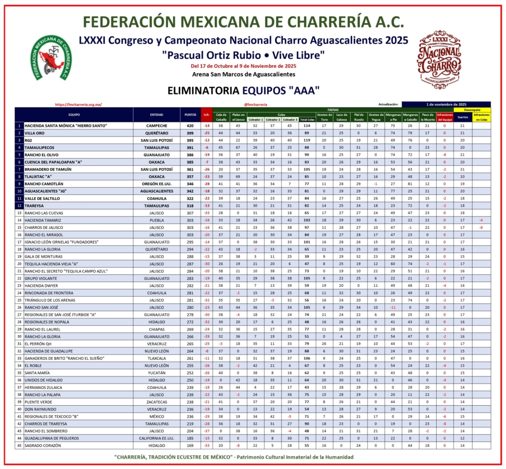 Al momento, Juan José Castro Ponce, de Rancho Camotlán de Oregon, es el charro más valioso de la categoría “AAA” con 151 puntos en la cuenta individual, colocándose en segundo sitio Luis Enrique Ramírez Pulido, de Hierro Santo de Campeche, con 148 unidades.