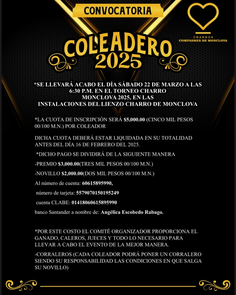 - Consulta los detalles de la Convocatoria del Torneo y la CONVOTORIA DEL COLEADERO.