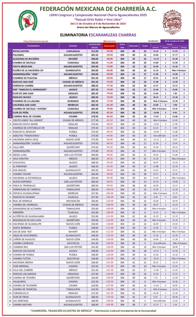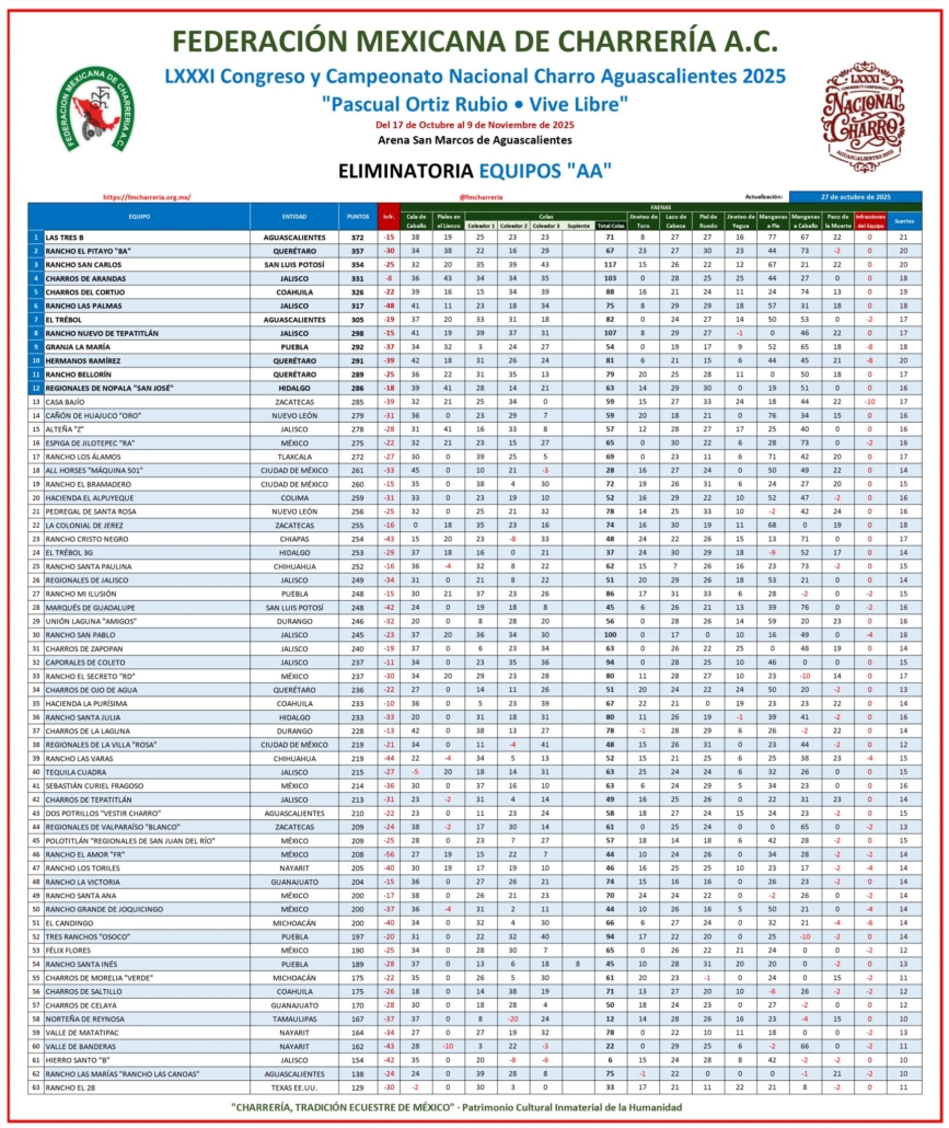 Una destacada actuación de los Charros del Cortijo de Coahuila la tarde del lunes en Aguascalientes les ha colocado en la quinta posición de la eliminatoria categoría “AA” del LXXXI Congreso y Campeonato Nacional Charro 2025 “Pascual Ortiz Rubio – Vive Libre”.