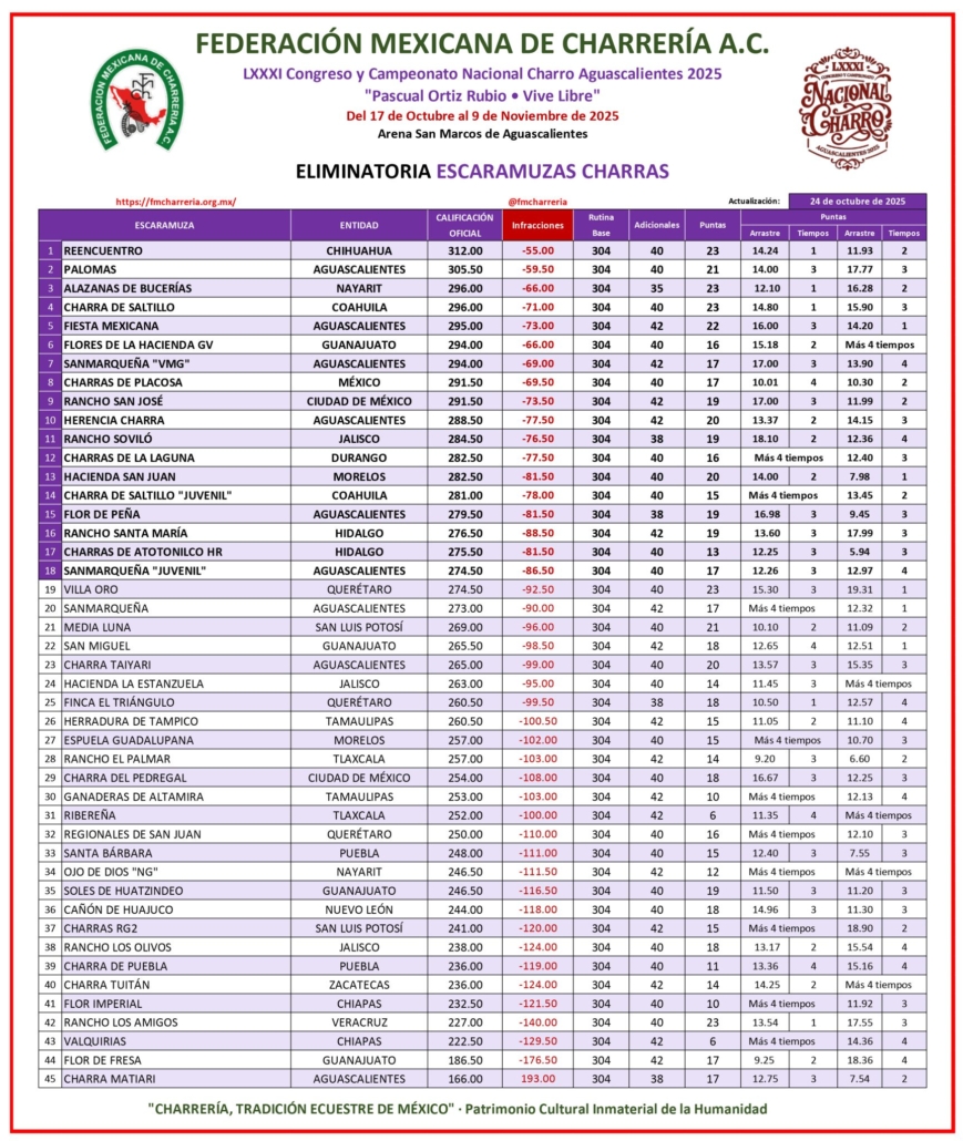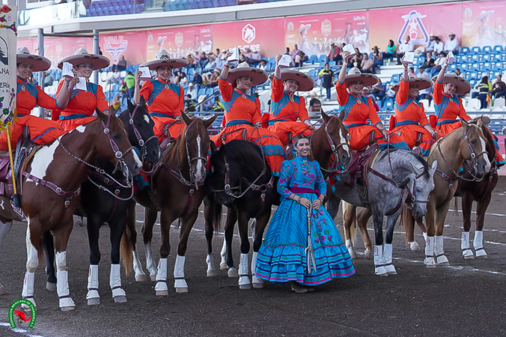 Actuaron además Magdiel Estefanía Mora Villalvazo, Jocelin Montserrat Rodríguez Guzmán, Naomi Isabel Ibarria Segura, Josselyn Melissa López de La Torre, Zulema Encarnación Ballesteros y Betania Romero Virgen, quienes conforman este elenco de damas charras, que ahora marcha detrás de las líderes, Reencuentro de Chihuahua, con 312.00 unidades, y Palomas de Aguascalientes, segunda con 305.50 buenos.