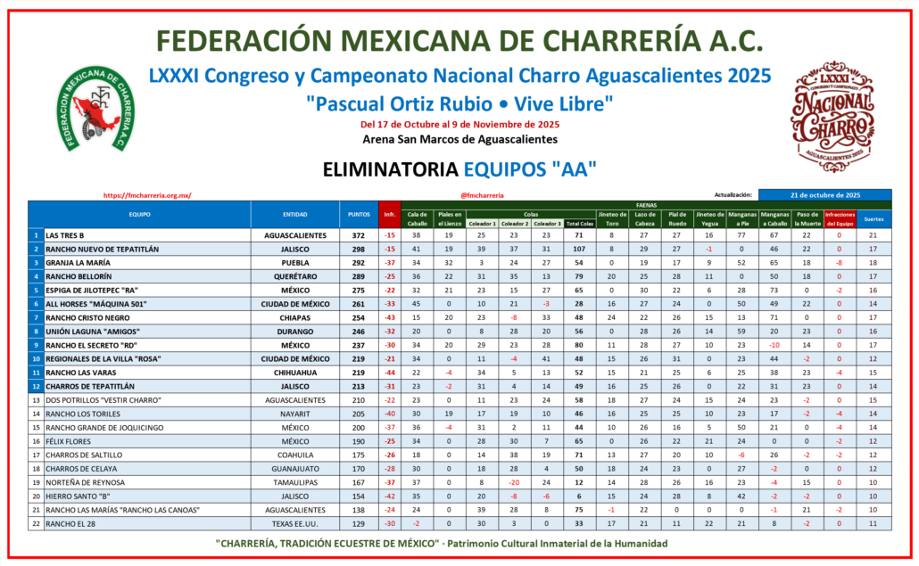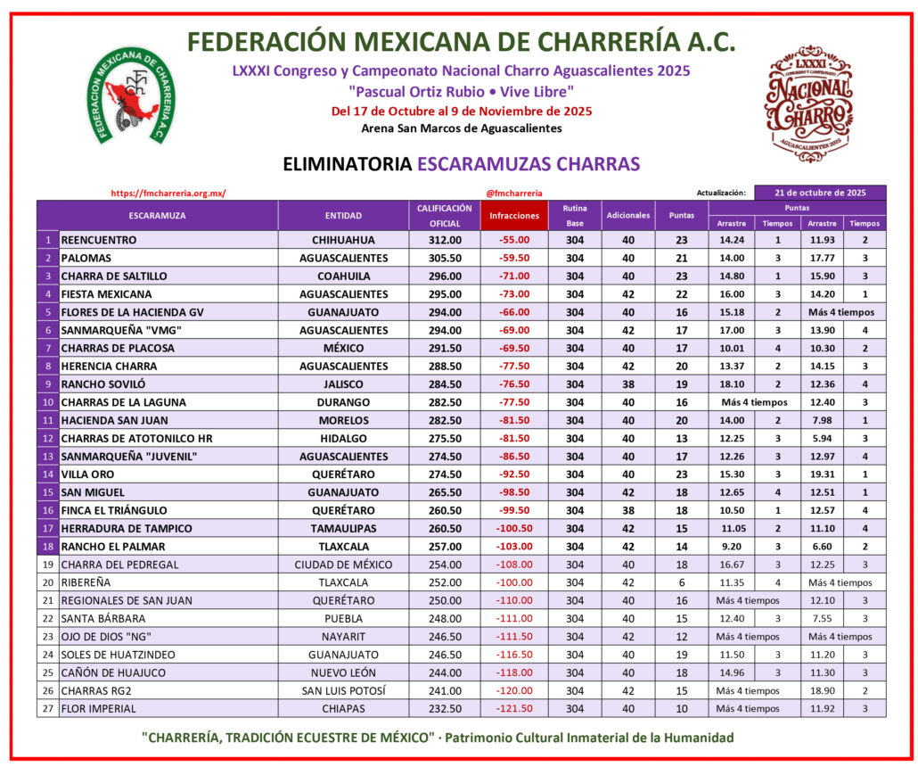 Al momento, la campeona defensora, Reencuentro de Chihuahua, continúa en primera posición con 312.00 puntos, Palomas de Aguascalientes marchan segundas con 305.50 unidades y en tercero están las Charras de Saltillo, Coahuila, con 296.00 buenos; Fiesta Mexicana de Aguascalientes, con 295.00, y Flores de La Hacienda GV de Guanajuato, con 294.00 tantos, aparecen en los puestos cuarto y quinto.