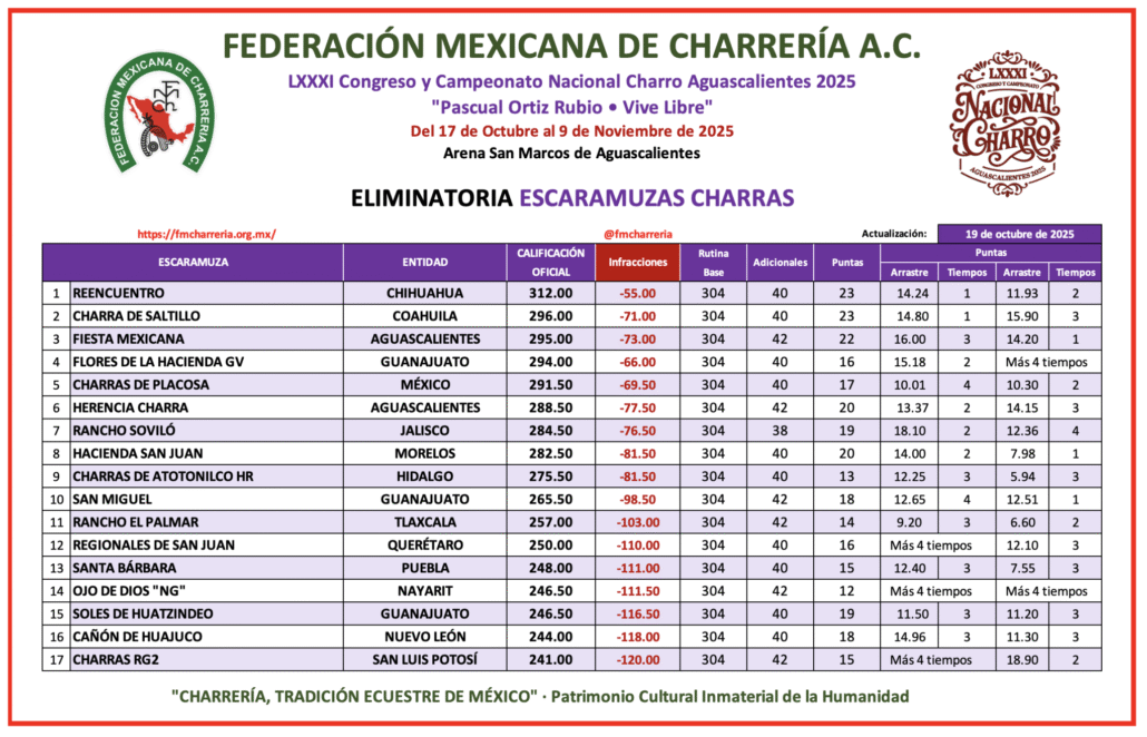 En una emocionante charreada, octava de la etapa eliminatoria de este certamen que se desarrolla en las instalaciones de la Arena San Marcos de la capital hidrocálida, también resaltó la escaramuza Charra de Saltillo, Coahuila, tercer lugar nacional en la edición 2024, y ahora refrendó la postura con promedio de 296.00 puntos, estableciéndose en el subliderato general.