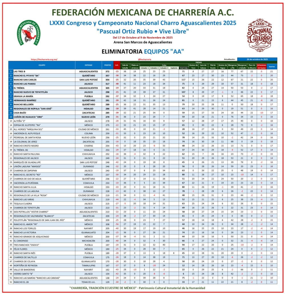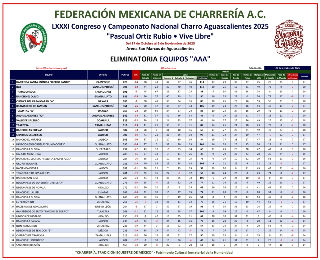 Todavía mejor resultó la participación de Rancho Las Palmas de Jalisco, pues su resultado de 317 puntos le ha permitido escalar hasta la cuarta posición de la categoría “AA”, a pesar de las infracciones de un pial en el lienzo y una mangana a caballo que no se pudo derribar.